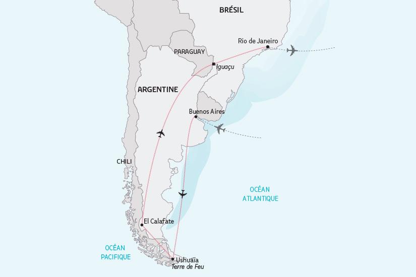 Les vols intérieurs Buenos Aires/Ushuaia, Ushuaia/El Calafate, El Calafate/Puerto Iguazu et Foz do Iguazu/Rio de Janeiro