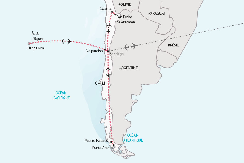 Les vols intérieurs Santiago/Punta Arenas, Puerto Natales/Santiago, Santiago/Calama, Calama/Santiago, Santiago/Hanga Roa et Hanga Roa/Santiago